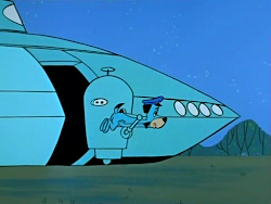 You can see how Rivera redesigned the metallic alien. No feet. No mouth speaker. And he doesn’t talk in “reverse track.” Instead, Don Messick invents a kind of electronic noise and “speaks” through the antennae on the alien’s head. The whole dialogue concept of drunk driving was not used; Huck instead wonders who’s illegally parked, asks the alien about the saucer then demands to see his driver’s license. I think the original dialogue’s better. And atypical for Huck, he turns to talk to the audience about the situation.