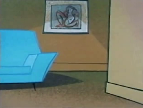 I posted a while ago about the various cars Snooper and Blabber had in their cartoons because I still have a fascination for that era of car design (late ‘50s). I wanted to do a similar post pointing out all the different suburban houses Augie Doggie and Doggie Daddy lived in (you see an interior from Foxhounded Hounded Fox to the right). But Emmy-winning director/storyboard artist Sherm Cohen came up with a better idea—the various living room chairs Doggie Daddy sat in, usually while reading a newspaper. So I’ve leafed through my old posts to give you some Doggie Daddy décor. The differences add to the series, in my estimation. The same chair, lamp, table and living room in each cartoon might get stale after a while.